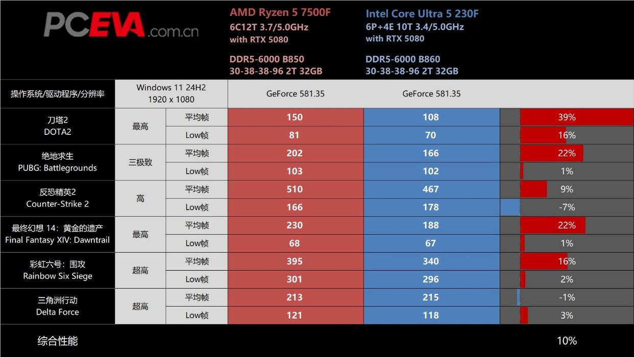 由此可见,ultra 5 230f虽然价格腰斩想要在千元市场来分一杯羹,但实际性能表现还打不过 2023年 amd第一款f系列产品的 锐龙5 7500f处理器,更不要说前一段刚刚上市的zen5架构的新品了,感兴趣的朋友可以看看我们之前的锐龙5 9500f首测文章。