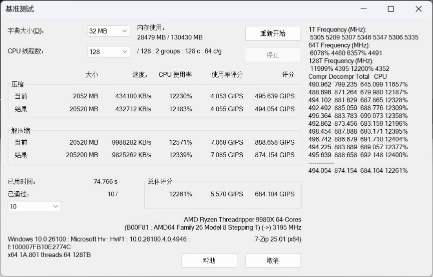 7zip用来测试处理器的压缩和解压缩性能,默认只支持64线程,但可以手动开到128线程。