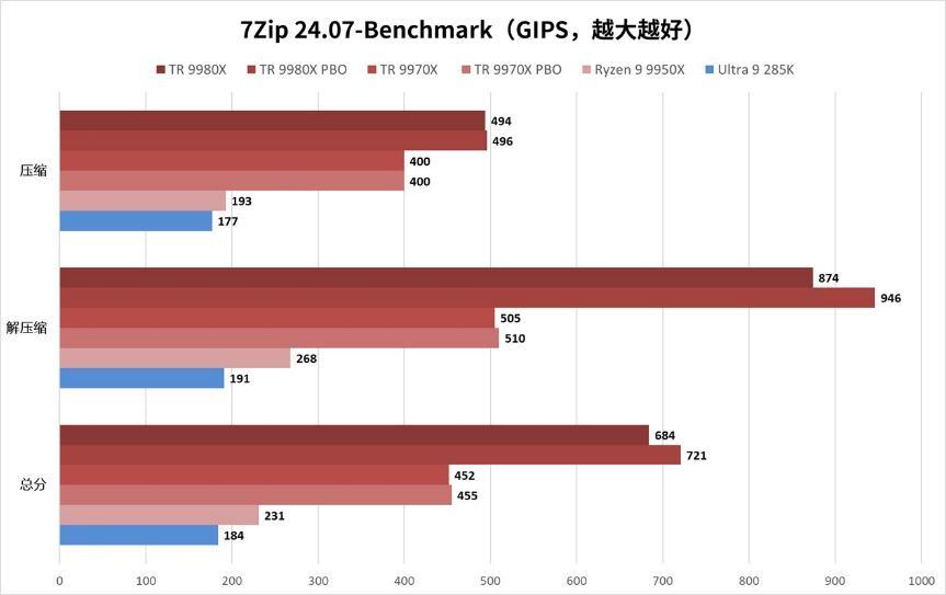 从测试结果看,tr 9980x的性能大约是r9 9950x的3倍左右,是285k的3.8倍左右;tr 9970x的性能大约是r9 9950x的1.9倍左右,是u9 285k的2.5倍左右。在7zip里,tr 9980x的128线程利用率还不错,解压缩性能几乎是r9 9950x的3.5倍性能,已经非常接近核心数的提升幅度。从这里也能看出,7zip的压缩性能对内存带宽敏感,而解压缩则对核心性能更敏感,tr 9980x开启pbo后,获得了8%的性能提升。
