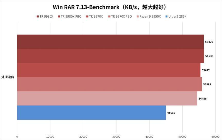 从测试成绩看,tr 9980和tr 9970x并没有比消费级的锐龙9 9950x和ultra 9 285k快多少,说明win rar虽然写着能支持到64线程,但并行运算能力优化不足,64线程的tr 9970x只比32线程的r9 9950x快2.5%,并行运算能力极限大概也就支持到32线程。