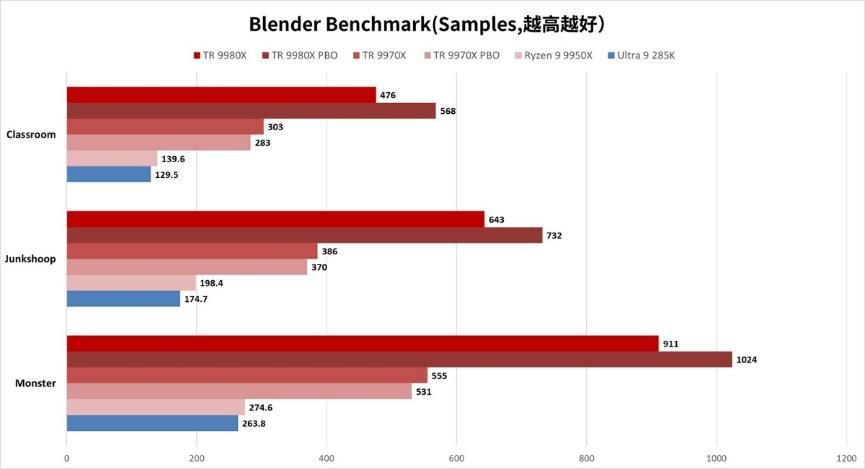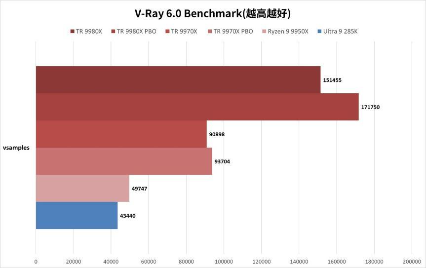 从测试结果看,tr 9980x的测试成绩大约是r9 9950x的3倍,开了pbo更是能达到3.5倍。和u9 285k对比,tr 99 80x的成绩大约是其3.5倍,开了pbo后能达到3.9倍。另外,tr 9980x开了pbo后,获得了13%的性能提升,可见v-ray对于128线程的并行优化度确实不错。tr 9970x的成绩大约是r9 9950x和ultra 9 285k的两倍,与r9 9950x对比的话,基本实现核心规模的等比例性能提升。