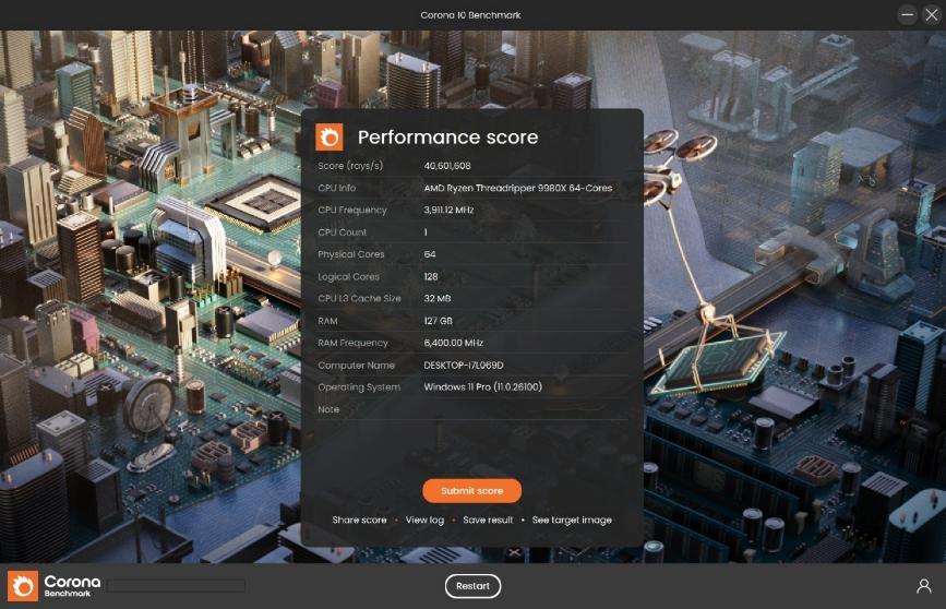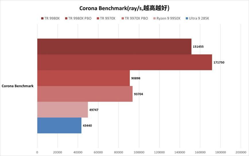 在corona benchmark里,tr 9980x的成绩大约是r9 9950x的2.7倍,开了pbo后大约是3倍的成绩。和u9 285k对比,tr 9980x的成绩大约是它的2.9倍,开了pbo后能达到3.2倍。tr 9970x的成绩大约是r9 9950x和u9 285k的1.9倍和2.1倍。虽不如v-ray,但tr 9000在corona渲染器里的提升也是非常大的。