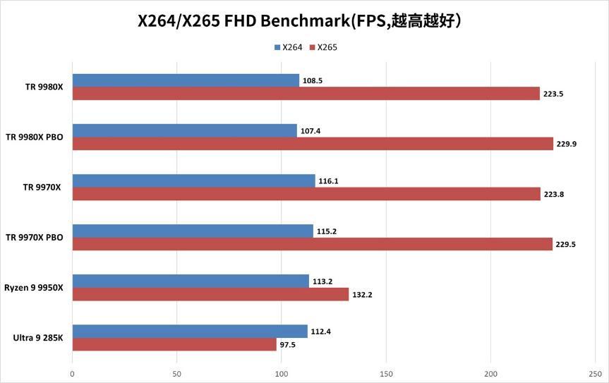 看得出来,x264对于多线程支持度较差,更吃核心频率。四款处理器在x264 -benchmark里的成绩基本相当,只有tr 9980x在相同负载下,频率略低一些,所以成绩低了大约6%左右。x265 fhd benchmark对多线程支持度就高了不少,tr 9000的成绩大约是r9 9950x的1.7倍,大约是u9 285k的2.3倍。不过tr 9980x和tr 9970x的成绩基本一样,说明x265最多也就支持64线程。