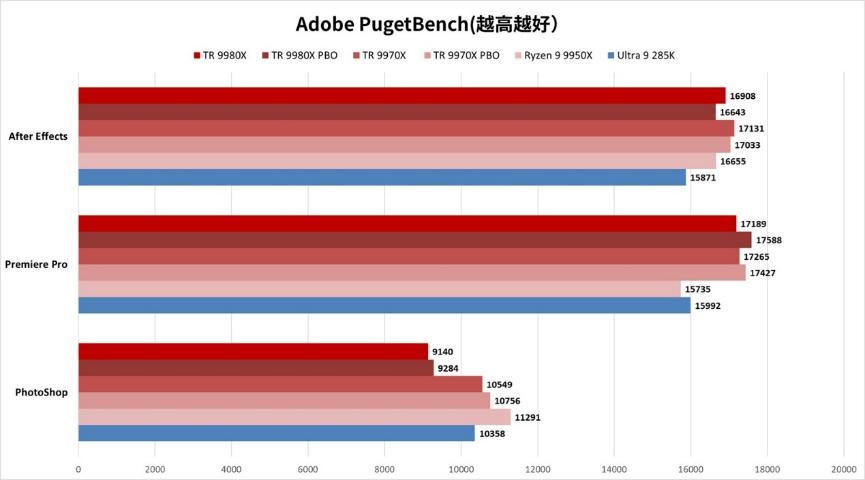 adobe三件套的成绩也是类似,tr 9980x并没能发挥出64核128线程的规模优势,成绩与tr 9970x基本相当或略低一些,adobe三件套的核心利用率只能到32核64线程。tr 9970x在ae里获得第一,比r9 9950x略高3%,比u9 285k高7%;在pr里与tr 9980x基本相当,但优于9950x和285k大约10%;在ps里则比r9 9950x低6.5%,比285k高1.8%。