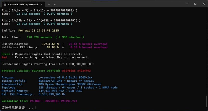 y-cruncher是一款专注于高精度计算数学的专业软件,支持avx512指令集,可计算圆周率、黄金比例等常数数学。我们使用其中的benchmark模式,计算1e+12的圆周率。