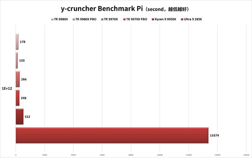 从测试结果看,tr 9980x的运算速度可谓是一骑绝尘,计算1e+12的圆周率,只需要178秒,耗时大约是r9 9950x的三分之一,u9 285的百分之1.5。造成如此大差距的主要原因是,tr 9000和ryzen 9000支持avx512指令集,而u9 285并不支持,所以tr 9980x的计算耗时要远低于u9 285k。而r9 9950x和tr 9980x的差距主要是核心数规模的差距,纯计算类的运用对于多线程的支持度还是非常好的,这一点从tr 9980x和tr 9970x的差距中也能看的出来。tr 9970x的运算速度大约比tr 9980x慢50%,耗时266秒,但依然比r9 9950x快1倍,与其核心数的规模基本相当。