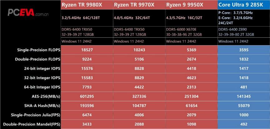 从测试结果看,tr 9980x、tr 9970x、ryzen 9 9950x的成绩符合其核心规格,成绩大多以50%递减,例如单精度浮点算力,三颗处理器的成绩是18527、10243、5369,前者大致是后者的2倍,上下有所出入的部分主要受功耗、温度等影响。尽管ultra 9 285k与r9 9950x定位相当,但在通用计算这块,还是不如r9 9950x,其主要原因是不支持avx 512以及大小核架构带来的短板,比较吃avx512的整数iops甚至只有9950x的1/4,和tr 9980x比,差距甚至能达到10-16倍。