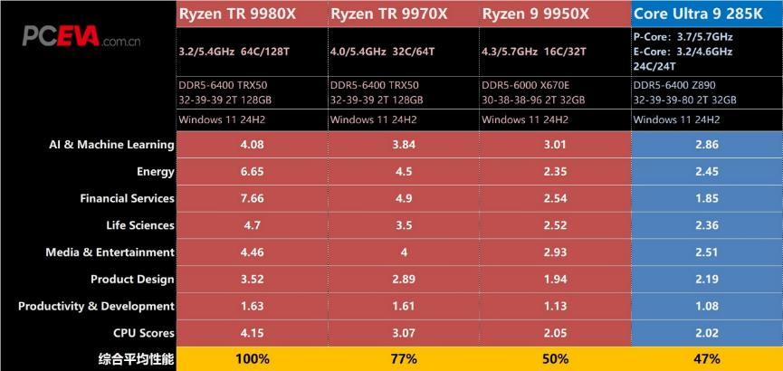 在spec ws里,以tr 9980x的得分做100%基准,tr 9970x大约是其77%的成绩,锐龙9 9950x大约是其50%的成绩,ultra 9 285k大约是其47%的成绩。这主要是因为spec ws是一项应用为导向的综合测试,也包含对显卡、内存、硬盘的测试,所以平均到综合分里,cpu的差距就不像渲染类或计算类的测试这么大。综合来说,tr 9980x和tr9970x的成绩依然比消费级的r9 9950x和u9 285k快得多,成绩基本是翻倍的水平。