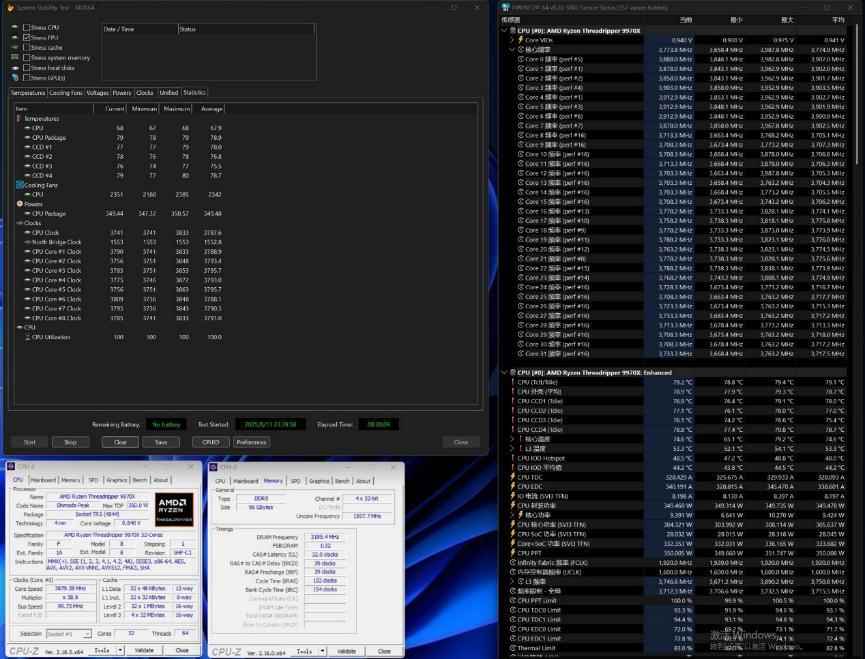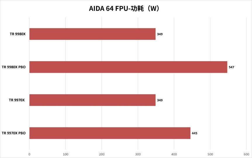 默认状态时,tr 9980x和tr9970x的最大功耗都是350w。开了pbo后,tr 9980x的平均功耗大约在547w,tr 9970x的平均功耗大约在445w,相对默认功耗分别提高了56%和27%。