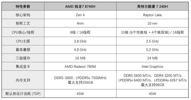 虽然amd锐龙7 8745h和英特尔酷睿 7 240h两款面向主流市场商用本的cpu,但在设计思路和技术参数上还是存在着很多的不同之处。比如英特尔酷睿 7 240h采用了p核+e核的混合架构设计,旨在提高能效水平,但因为核心异构、指令集不同,会存在调度上的延迟而响应迟滞。而锐龙7 8745h因为采用全大核设计,不存在类似问题。制程方面,amd采用了领先的tsmc 4nm finfet,而intel则采用了自家intel 7的10nm工艺,差距还是很大。
