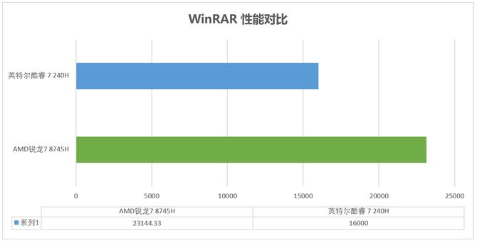 可以看到,凭借在多核性能方面的优势,amd锐龙7 8745h在两款解压缩类软件的测试中成绩均明显优于英特尔酷睿 7 240h。其中,7-zip项目中锐龙7 8745h略微领先3%,而winrar就差距非常大了,锐龙领先酷睿高达45%,几近五成,对于大型文件的压缩处理速度而言锐龙优势巨大。