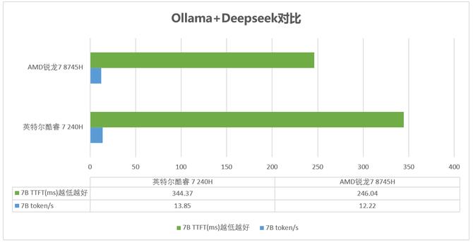 首先看下在ollama中部署deepseek 7b和qwen14b的表现。deepseek 7b的测试中,英特尔酷睿 7 240h的得分为13.85token/s,amd锐龙7 8745h的得分为12.22token/s,酷睿稍微领先一点,但是在首token 延迟ttft(ms)时间上,amd锐龙7 8745h则取得了246.04ms成绩,延迟时间远低于英特尔酷睿 7 240h的344.37ms,使用体验上明显会更流畅。