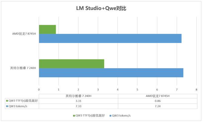 qwen3测试项目中,英特尔酷睿 7 240h和amd锐龙7 8745h分别取得了7.33tokens/s和7.24tokens/s的成绩,非常接近。但是,酷睿3.31ms和锐龙0.86ms的首token延迟差距同样差距较大,锐龙7 8745h相较对手节省了74%的时间。