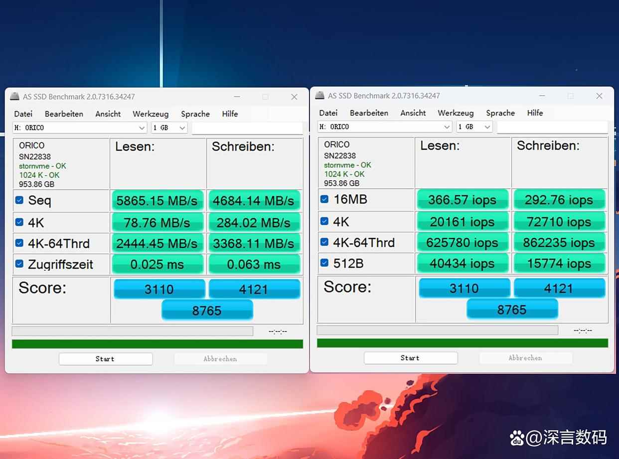 as ssd benchmark基准性能测试软件,在读写性能结果会比cdm软件稍微低一点,实测奥睿科ig740pro 1tb固态硬盘顺序读取写入速度分别为5865.15mb/s与4684.14mb/s,而4k单线程读写速度分别为78.76mb/s与284.02mb/s,总成绩为8765分。