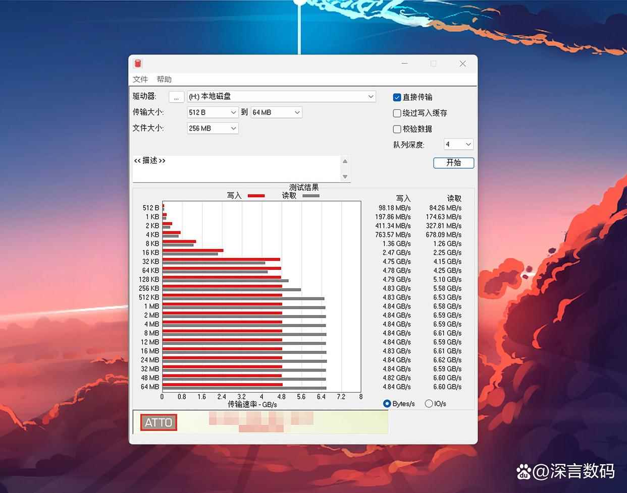atto disk benchmark基准性能测试软件,可测试固态硬盘在面对不同大小文件时的读写速度,4k体积文件的读写速度为678mb/s与763mb/s,当文件大小在32kb或以上时写入速度达到满速,最大读取写入速度分别为6.61gb/s与4.84gb/s。