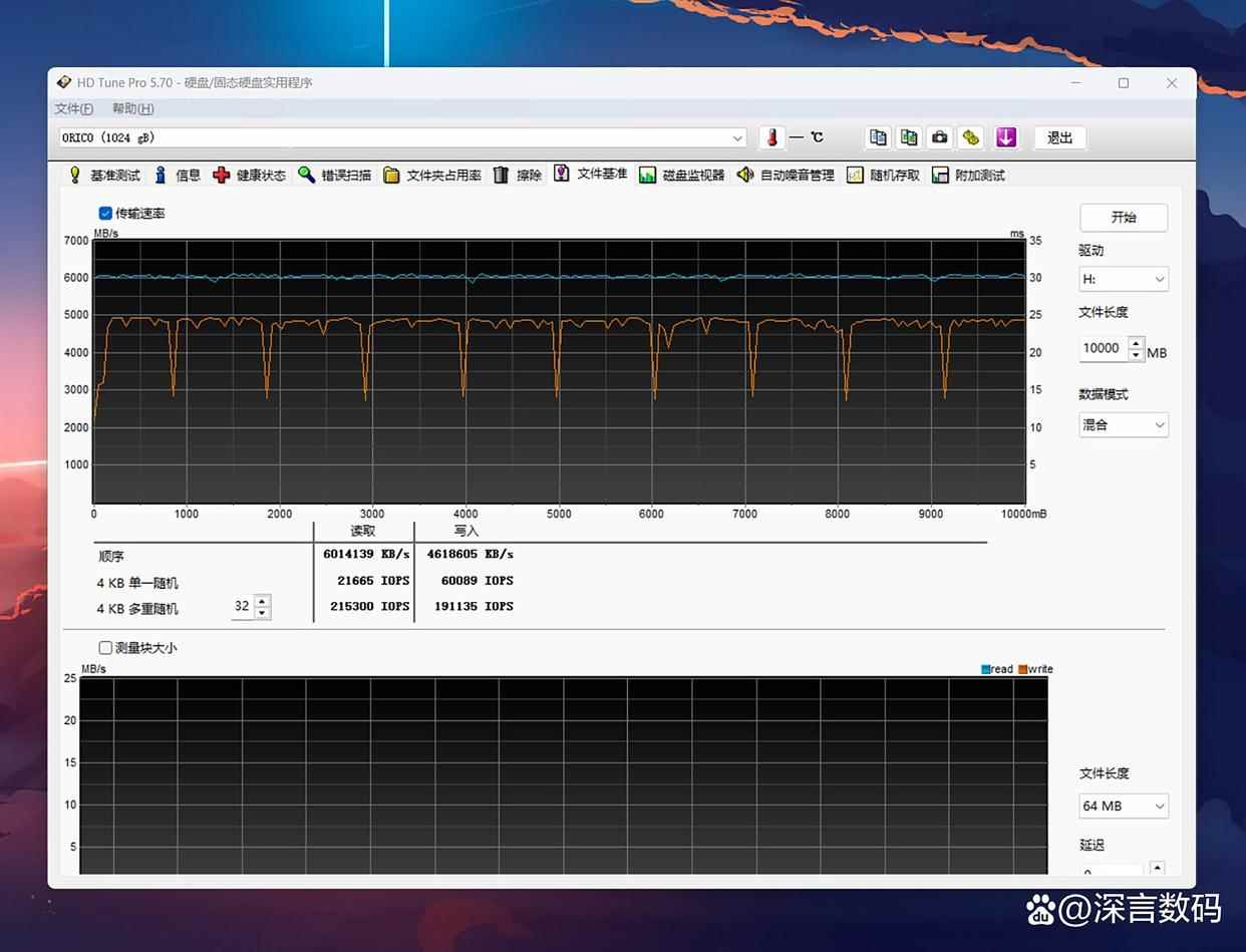 hd ture pro基准性能测试软件,选择文件基准测试项目,并将文件长度设为10gb以及混合模式,模拟往固态硬盘分别读写10gb大小的数据文件,从测试结果来看,奥睿科ig740pro 1tb固态硬盘的读取速度为6014mb/s,写入速度为4618mb/s。