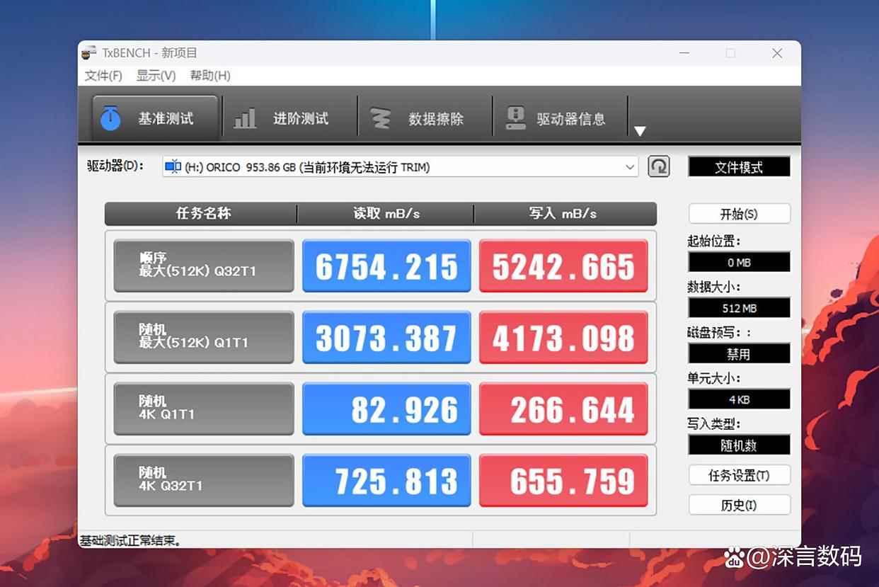 txbench基准性能测试软件,实测奥睿科ig740pro 1tb固态硬盘的顺序读取写入速度分别为6754mb/s与5242mb/s,4k单线程随机读取写入速度分别为82mb/s与266mb/s。