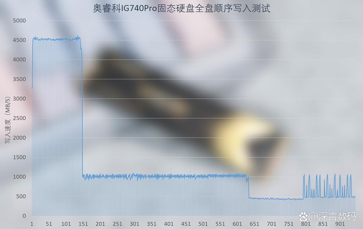 全盘连续写入测试,从结果图表可见,奥睿科ig740pro 1tb固态硬盘呈现出三段式写入速度,在控盘状态下slc缓存空间在150gb左右,写入速度为4500mb/s,然后是tlc直写阶段,写入速度为1000mb/s,第三段是gc(垃圾回收)阶段,此时写入速度会降至约500mb/s,全盘写入总耗时约21分钟。