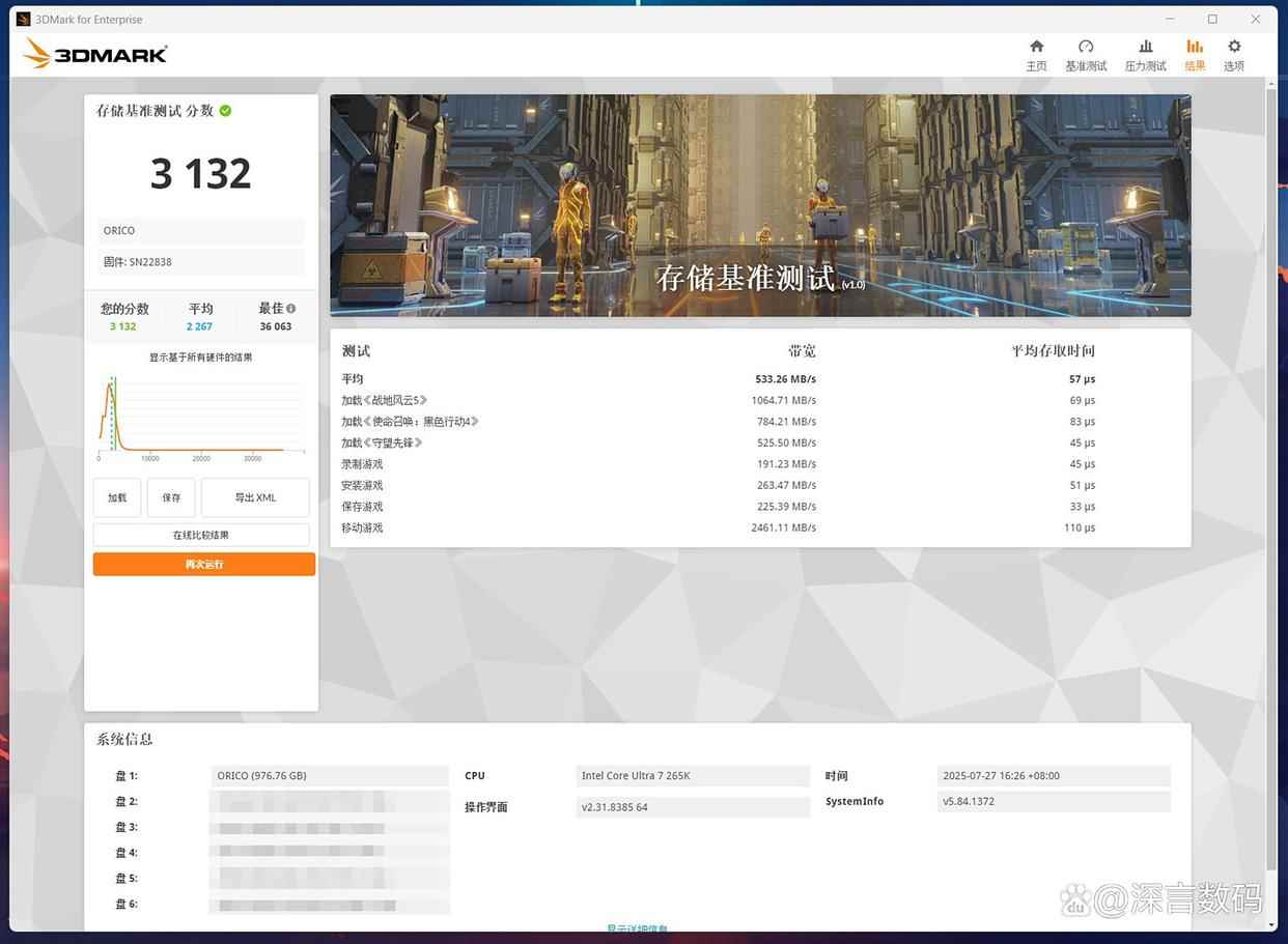 3dmark基准性能测试软件,选择存储基准测试项目,奥睿科ig740pro 1tb固态硬盘在该测试项目中的得分为3132,平均带宽为533.26mb/s,平均存取实际为57μs,在加载《战地风云5》游戏时带宽为1064mb/s,移动游戏时带宽为2461mb/s。