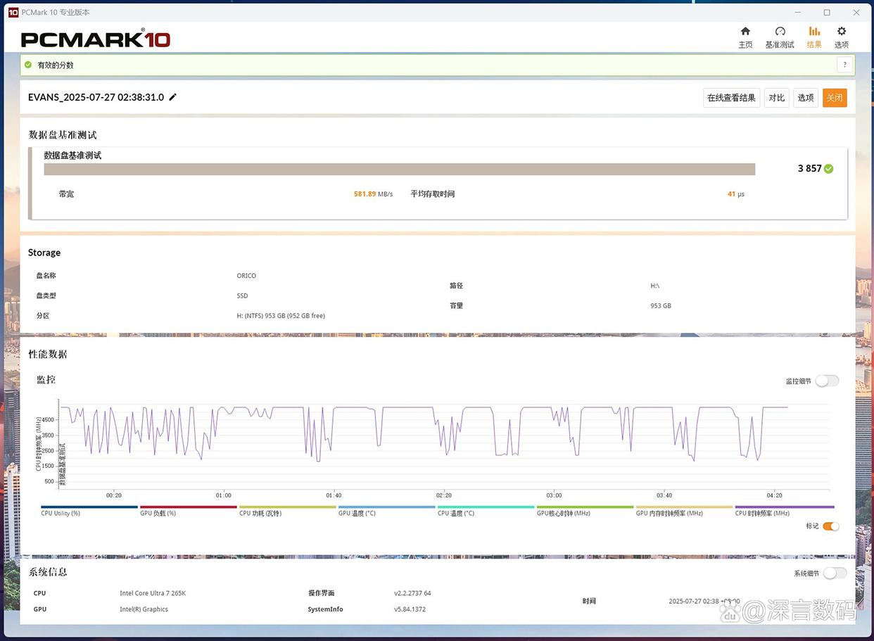 pcmark基准性能测试软件,选择数据盘基准测试项目,奥睿科ig740pro 1tb固态硬盘在该项目中的测试成绩为3857分,平均传输带宽是581.89mb/s,平均存取时间为41μs。