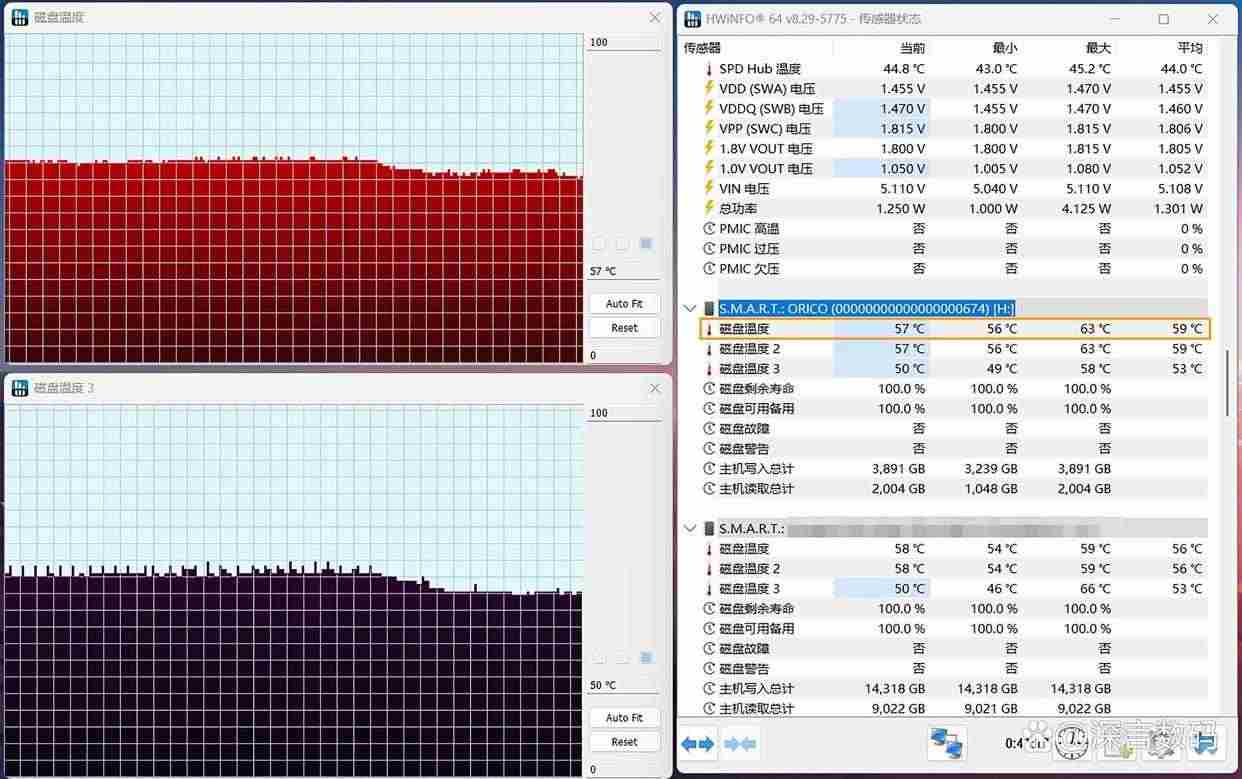 最后是温度测试部分,测试期间的环境温度约为28℃,本次搭配主板自带的铝合金材质散热模块辅助散热,利用检测软件记录固态硬盘在全盘写入测试期间的温度表现,提供了三个温度数据,显示固态硬盘的最高温度为63℃,有效控制了高温对性能的影响,从全盘写入测试中可见并未出现因高温突然降速的情况。
