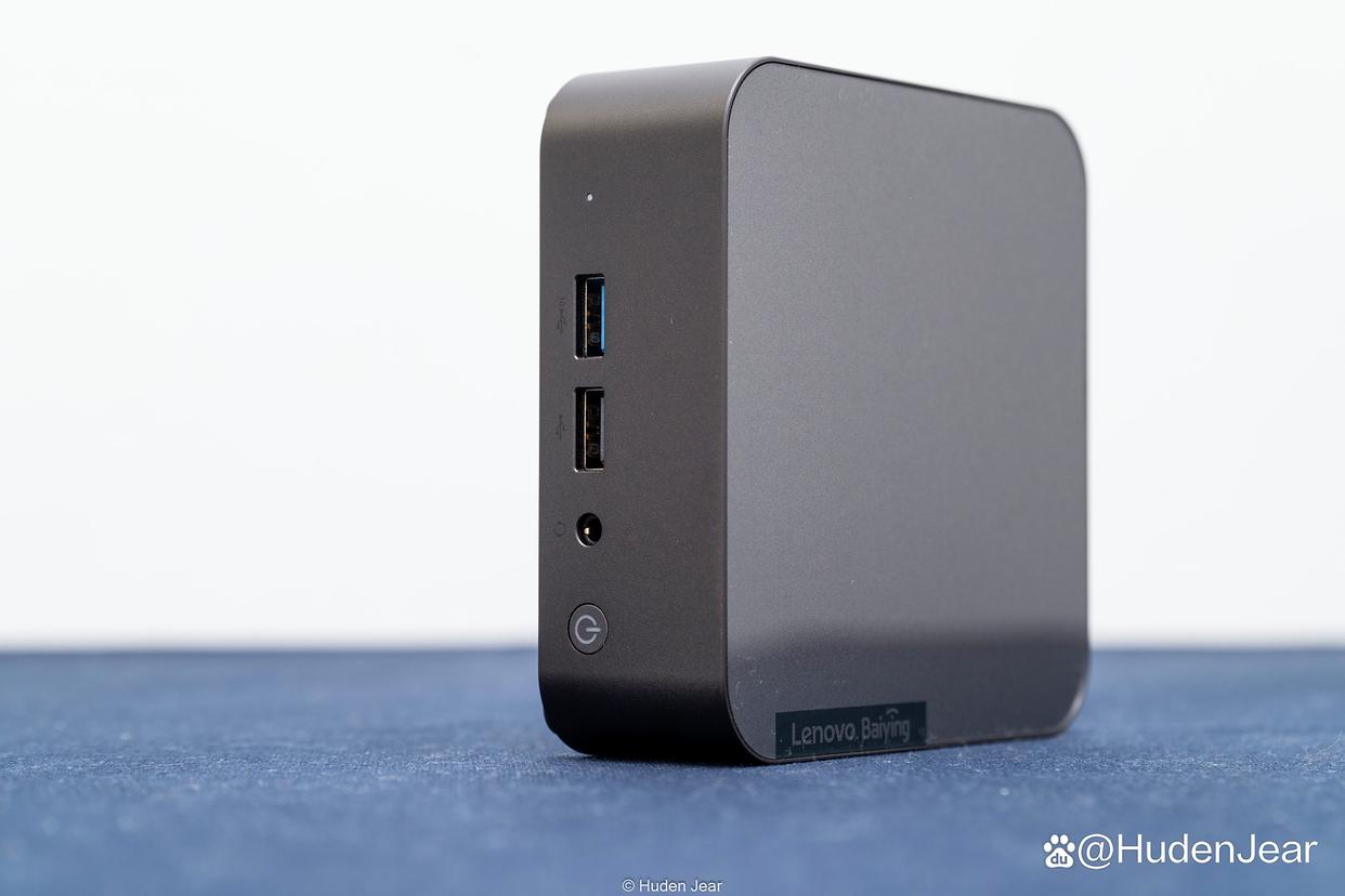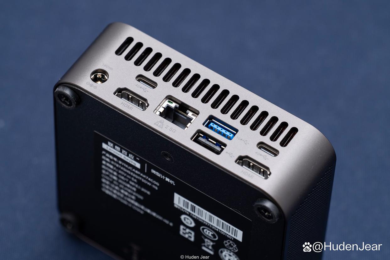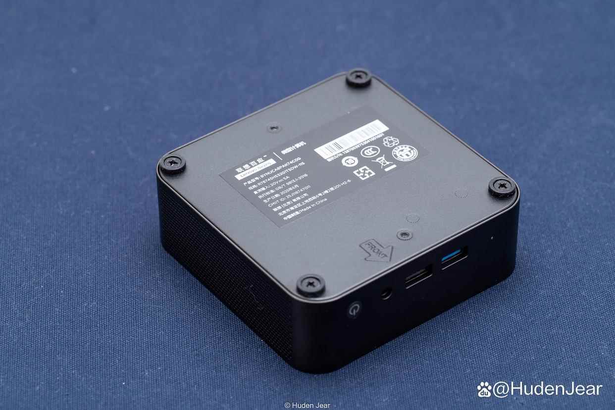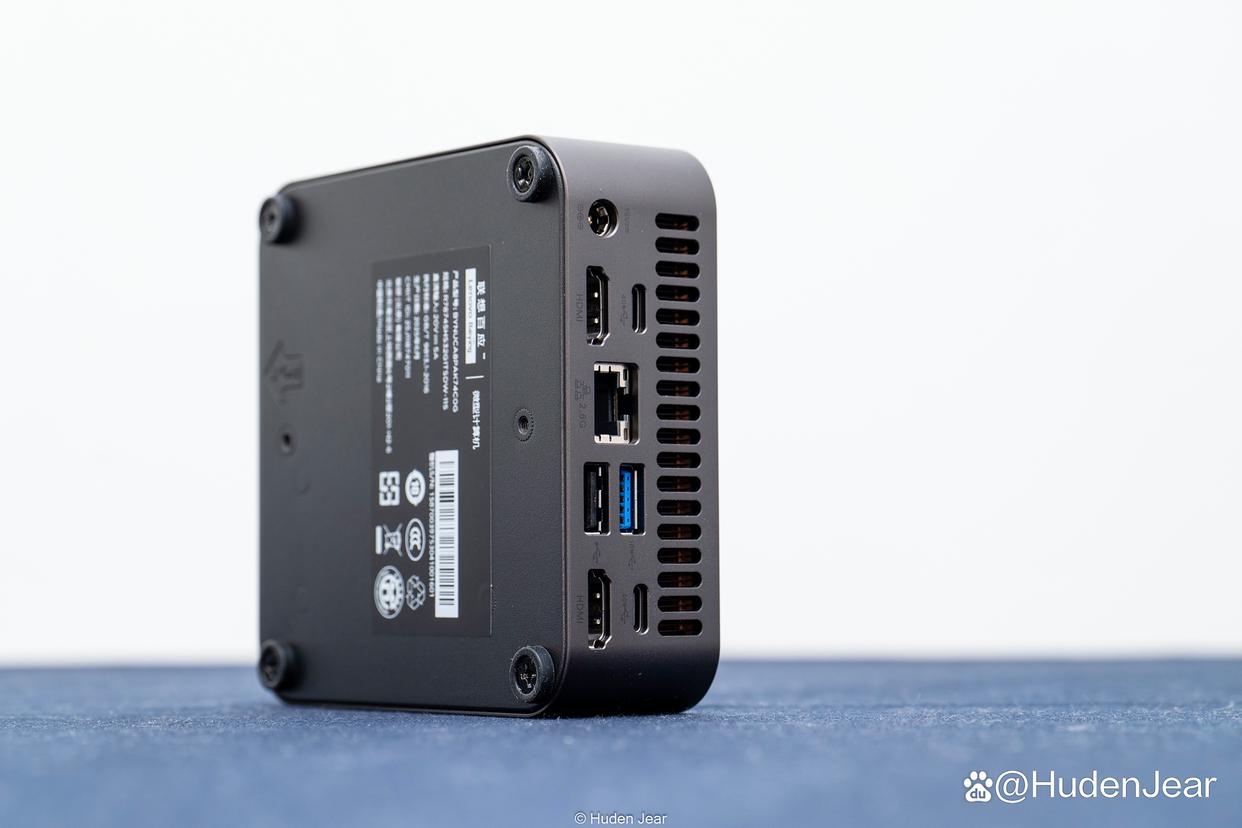 联想百应nuc13的前侧io有两个usb-a,其中一个是usb3.0,还有一个耳机用的3.5mm接口。而机身后面的接口就非常丰富了,除了一个供电接口之外,特别给了两个type-c和两个usb-a,其中type-c可以接电源,还有一个网口和两个hdmi,最大可以直连4个显示器