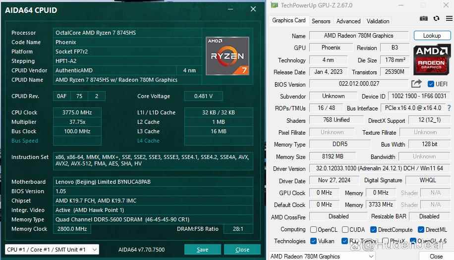 再来看一下性能吧,毕竟外壳和做工给的是面子,真要好用才是里子。从配置上看,联想百应nuc13这一台的配置是amd锐龙r7 8745hs,这是一个自带核显的8核apu,同时不带npu,所以功耗可以控制的更好,价格相对便宜。这颗apu的核显可以自由调节显存,我这里选了8g,这样就能基本无障碍地使用显存相关的应用了