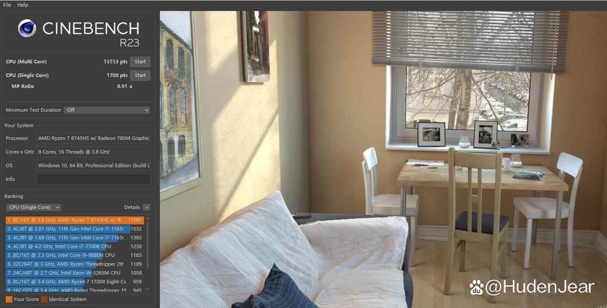 cpu部分的性能非常强,8745hs的cinebenchr23跑分可以达到15000的多核以及1700的单核,能超过不少笔记本,在系统流畅度以及运算速度上已经是桌面主流级的性能,用了游戏渲染测试的软件3dmark来测了cpu性能,非常充裕