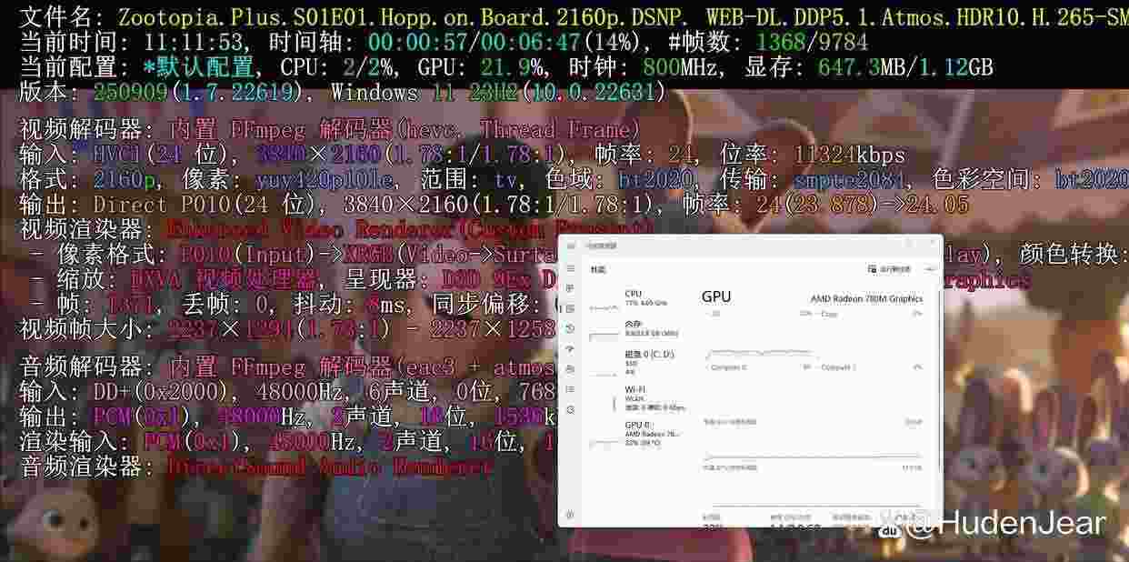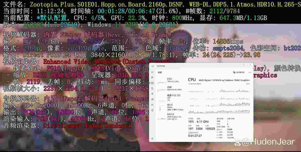 然后我也测试了一下视频解码的能力,可惜没有找到4k 60hz的片源,不过4k 24帧的片源解码只用了17%的性能,即使x4也毫无畏惧。780m最高能支持av1 8k的解码,所以当电视盒子看视频完全不用担心解码不够