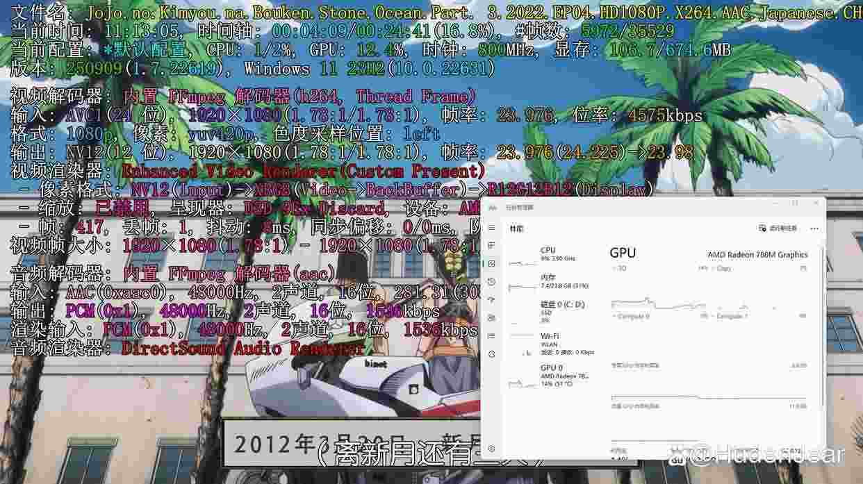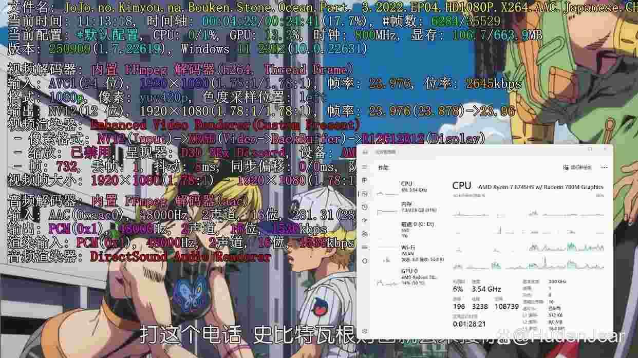 如果是一般片源,1080p24帧和60帧就对这个显卡丝毫不构成压力了。正好jojo第七部也快上线了,先把第六部的动画看了哈哈哈