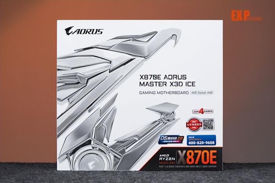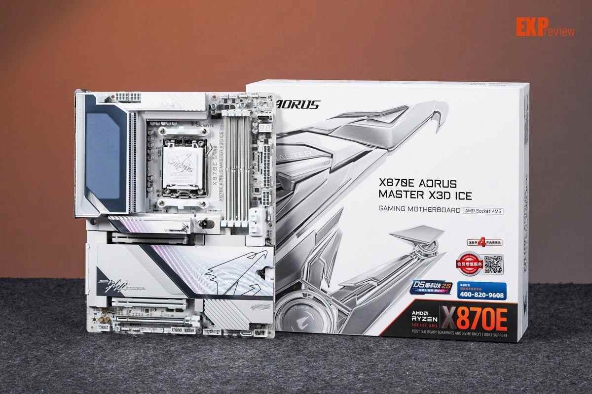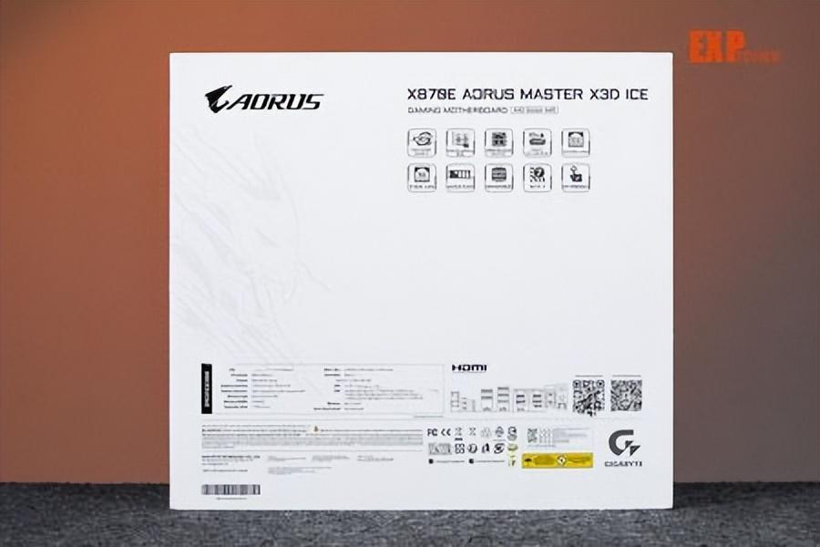 作为冰雕系列产品,x870e aorus master x3d ice采用了全白色的包装,包装正面印有主板的型号和技嘉aorus的雕型logo,而背面则印有主板的特性,很明显的写着主板采用18+2+2相供电设计,支持x3d turbo 2.0技术,配备双pcie插槽快拆,配备10g+5g双网卡,支持wifi 7。