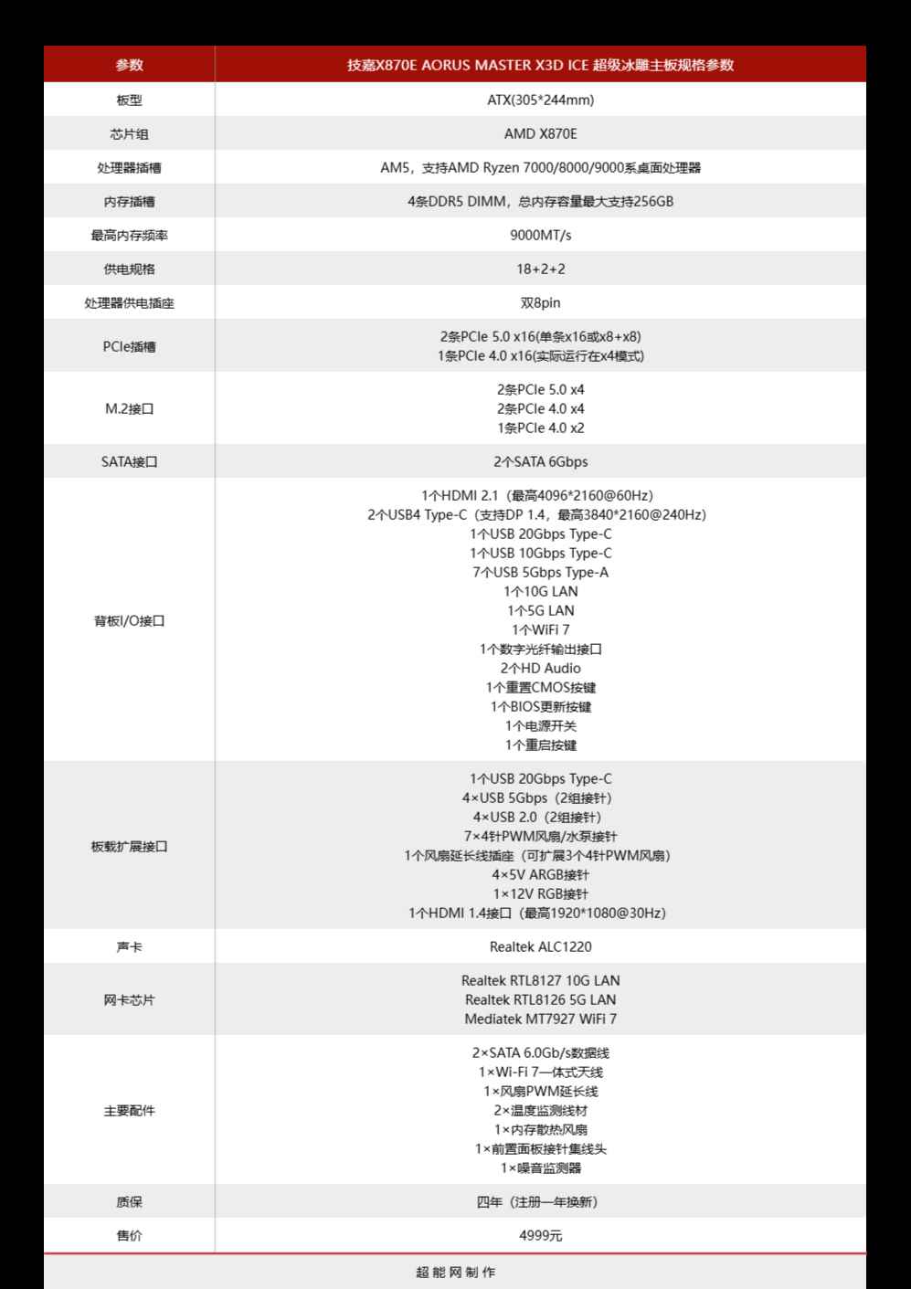 技嘉x870e aorus master x3d ice超级冰雕是一块标准的atx主板,尺寸是30.5*24.4cm,售价是4999元,这价格和技嘉x870e aorus master超级雕刚上市时是一样的。