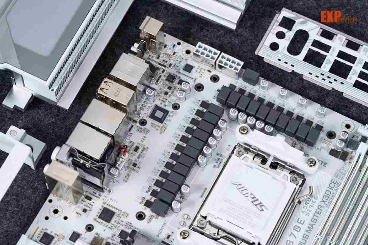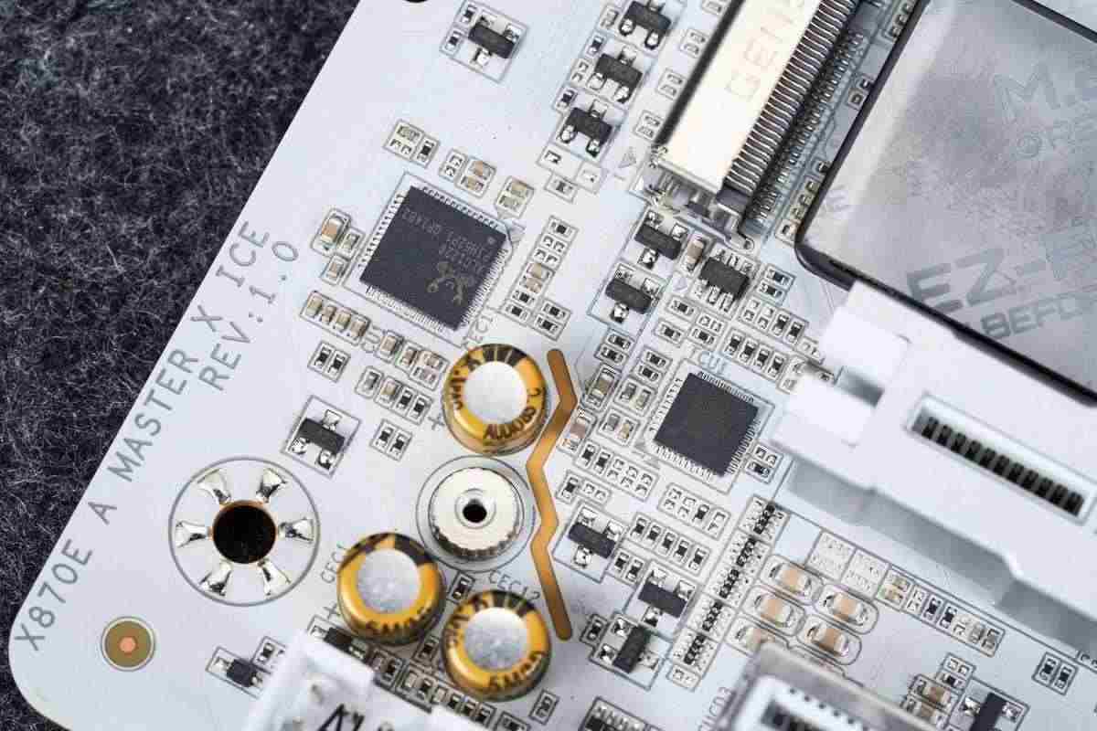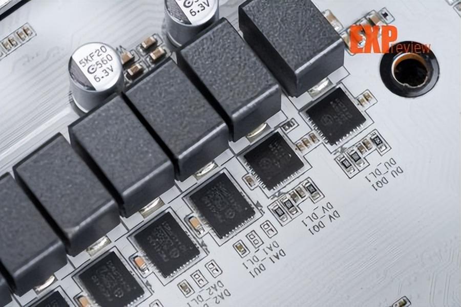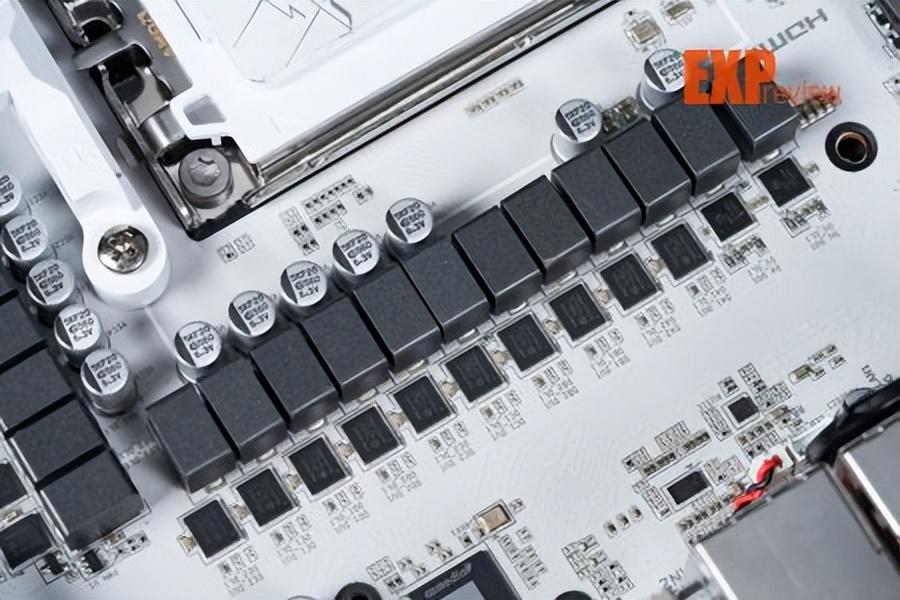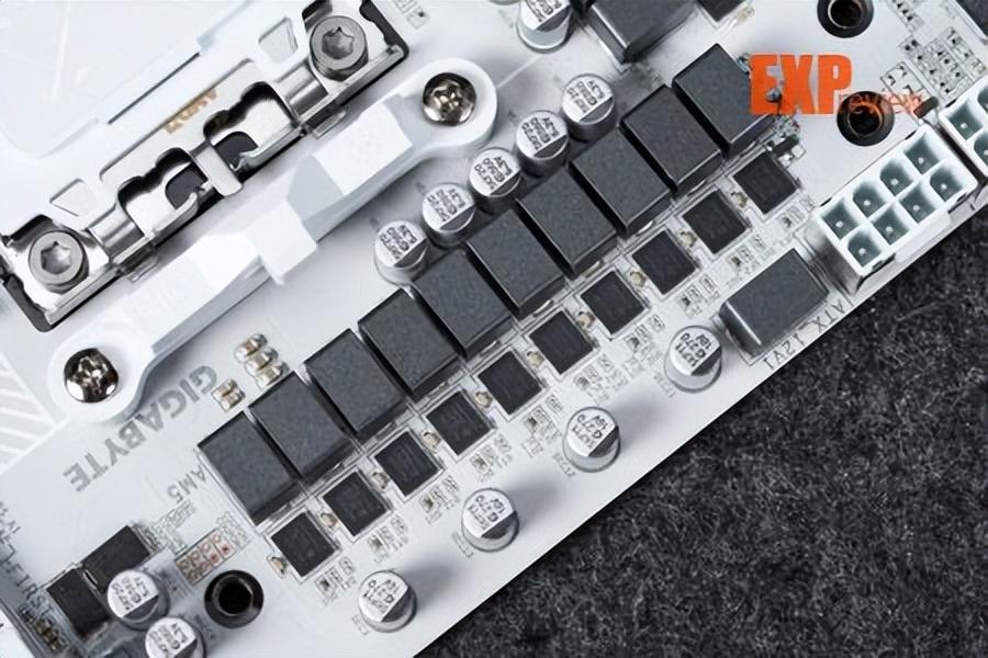 技嘉x870e超级冰雕的供电从x870e超级雕的16+2+2相升级为18+2+2相,cpu与核显供电使用英飞凌的pmc41430 dr.mos,单颗最高输出110a,属sps智能供电芯片,能够实现独立监控、优化每一相供电,实时调整供电参数,确保处理器在不同工作负载下都能获得稳定的电力供应。供电控制芯片为英飞凌的xdpe192c3d,最大支持12相双通道供电,即核心供电部分实际应该为9相并联。辅助供电采用的mos是安森美的ncp302155r,它也是dr.mos,单颗最大输出60a,这两相供电由立琦rt3672ee控制。