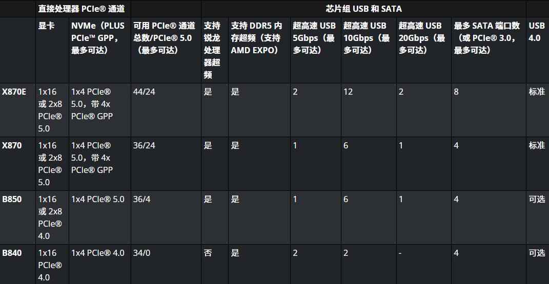 800系列芯片组则对定位进行了变更,x870e和x670e的规格是一样的,同样的双芯片架构。但是x870却变成了和b650e一样的单芯片设计。和上代不同的是,现在x870e/x870强制要求主板必须配备usb4接口。