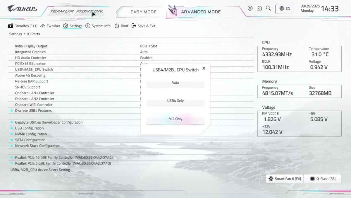 以支持该分配方案的技嘉 x870e aorus master x3d ice主板为例,我们可以在其主板bios的io接口设置中看到“usb4/m2b_cpu switch”选项,该选项有“auto”“usb4 only”“m.2 only”三个选项。