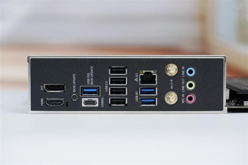 七彩虹战斧b850m超级黑刃主板的一体式挡板,从左到右分别是一个dp和一个hdmi视频接口,bios升级按钮,支持10gbps和bios一键升级的usb-a接口,一个usb-c接口,4个usb 2.0接口,5g有线网接口和两个5gbps的usb-a接口。