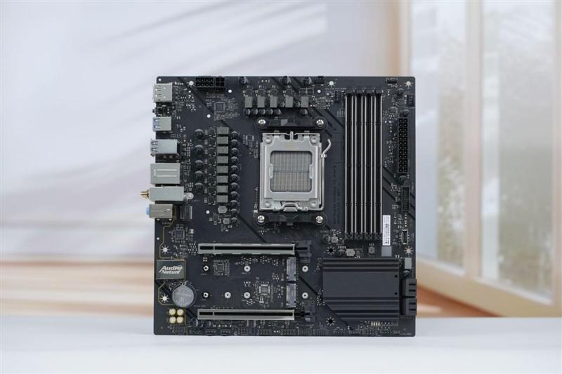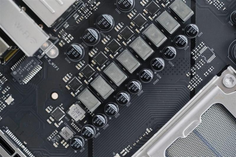 七彩虹战斧b850m超级黑刃主板的10+2+1供电部分的特写,采用55a drmos供电,哪怕是amd锐龙 9 9950 x3d这样的顶级cpu也能默认满载运行。