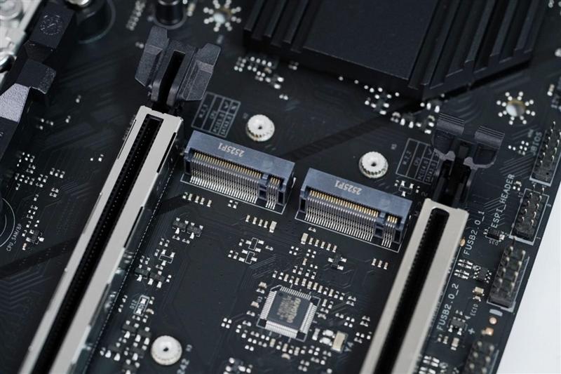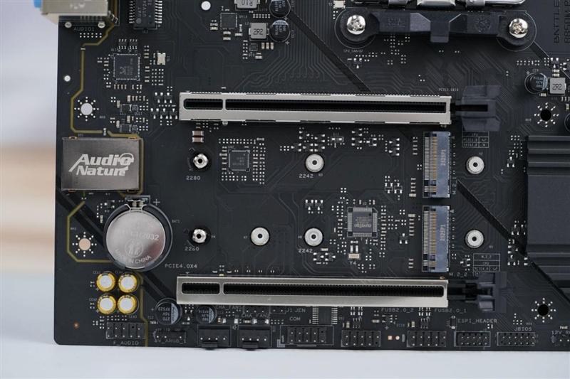 七彩虹战斧b850m超级黑刃主板的两个ssd插槽,上方插槽支持pcie 5.0 x4,下方支持pcie 4.0 x4,玩家如果搭配pcie 5.0 ssd的话记得安装在上方插槽以释放全部性能。