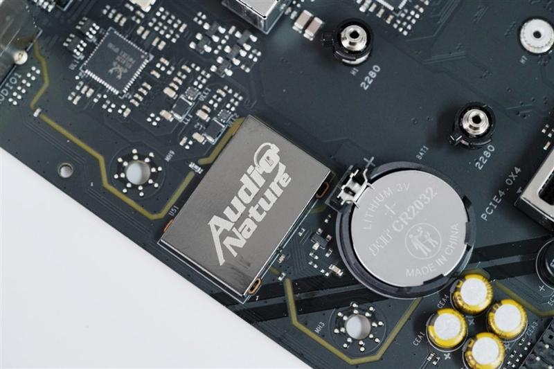 七彩虹战斧b850m超级黑刃主板搭载的realtek alc897音频芯片,旁边还搭配了4个金色的音频专用电容。