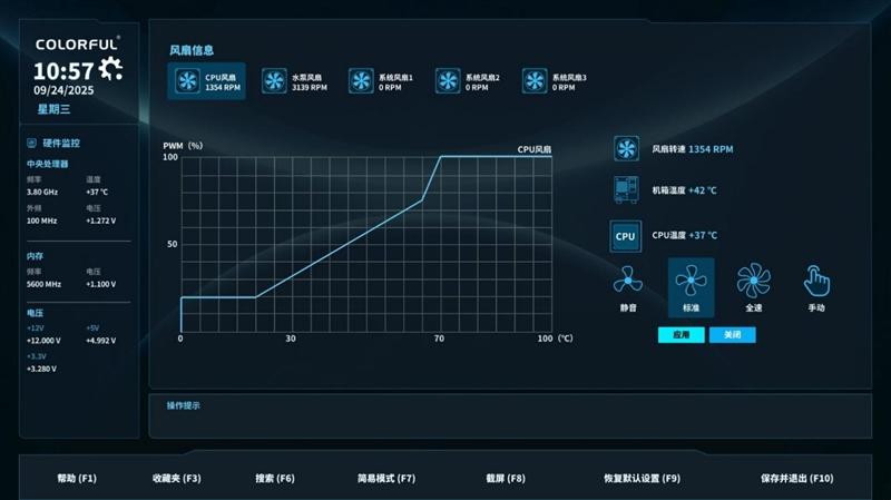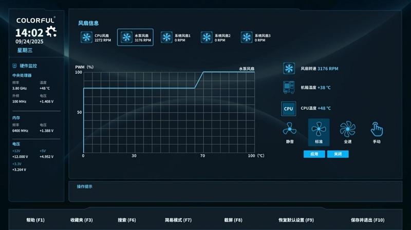 每个风扇都提供了标准模式、全速模式、静音模式和手动模式供用户选择。