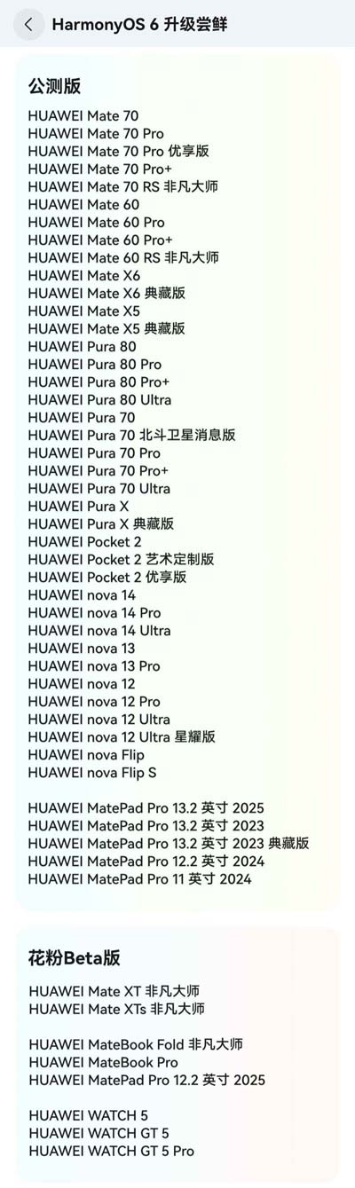 注意到,华为官方已公布鸿蒙 harmonyos 6 公测版手机 / 平板适配机型,名单如下: