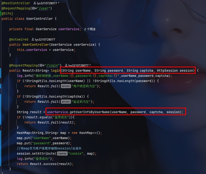 3.在usercontroller类新增captcha形参接收来自captchacontroller类的请求,并传递给userservice