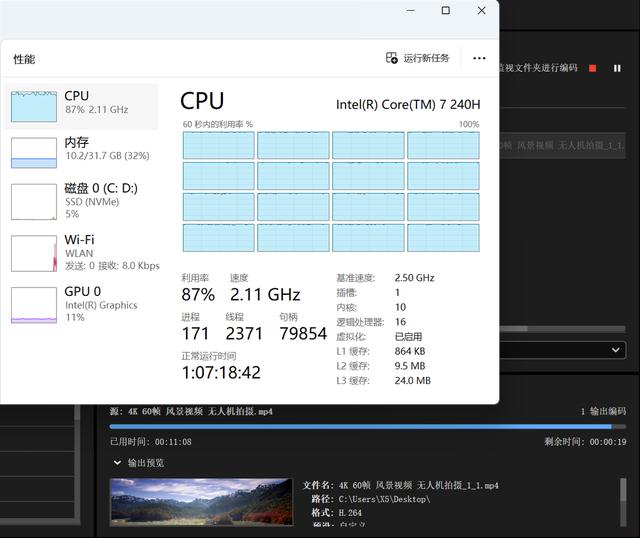 当下视频剪辑也是常见应用,利用media encoder将18分钟4k视频转码为1080p视频,纯cpu计算,慧天x5耗时约11分30秒,效率不错。一般企业制作或编辑的短视频时长大多在5分钟以内,转码这类视频耗时会更短,也就三四分钟,慧天x5也能满足企业用户偶尔处理短视频材料的需求。