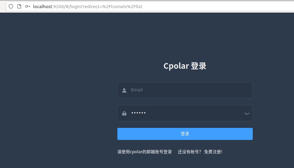 cpolar安装和成功启动服务后,在浏览器上输入ubuntu主机ip加9200端口即:【http://localhost:9200】访问cpolar管理界面,使用cpolar官网注册的账号登录,登录后即可看到cpolar web 配置界面,接下来在web 界面配置即可: