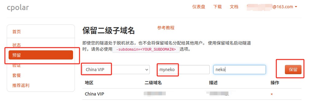 保留成功后复制保留的二级子域名地址:myneko