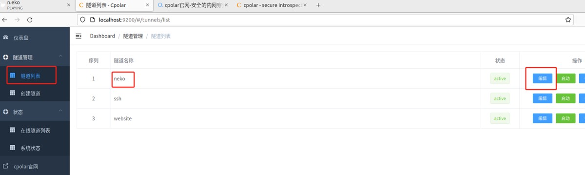 登录cpolar web ui管理界面,点击左侧仪表盘的隧道管理——隧道列表,找到所要配置的隧道neko,点击右侧的编辑。