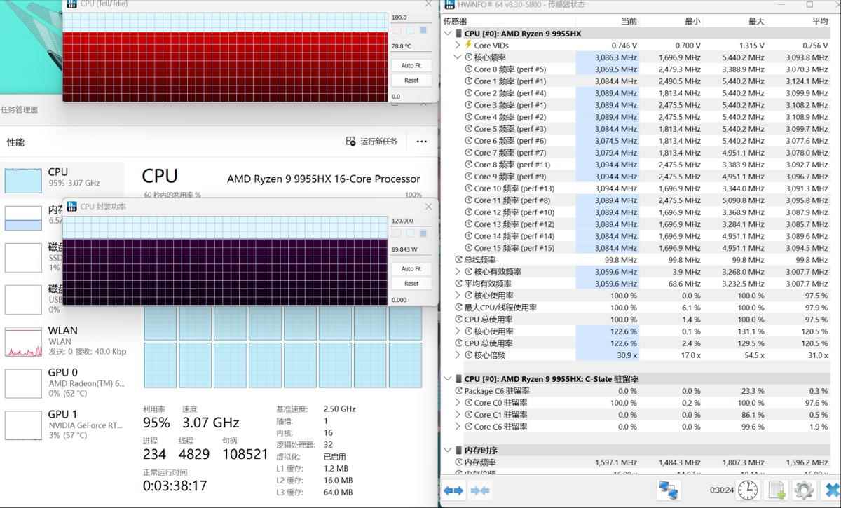 具体到天选6 pro锐龙版身上,室温25℃左右,对该机进行单考处理器半小时,锐龙9 9955hx考机功耗稳定在90w附近,频率约为3.1ghz,温度约78.8℃。很明显,该机是一款均衡型性能释放游戏本,90w的功率对于锐龙9 9955hx来说非常甜点,而满载温度还不到80℃,在游戏本上可以说非常凉爽了。此外,考机表现也体现出zen 5架构cpu的高能效优势,90w满载下cpu频率可到3.1ghz,表现优异。