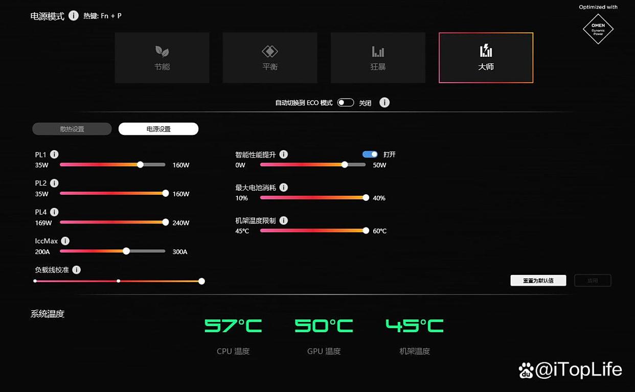 大师模式的电源则是这次omen gaming hub重点,可以看到,可调整的选项包括了cpu pl1,最高可至160w,pl2和pl4则分别可以达到160w和240w。pl即power limit,是英特尔平台用来限制处理器在不同负载场景下的最大功耗,从而平衡性能、温度和供电能力。