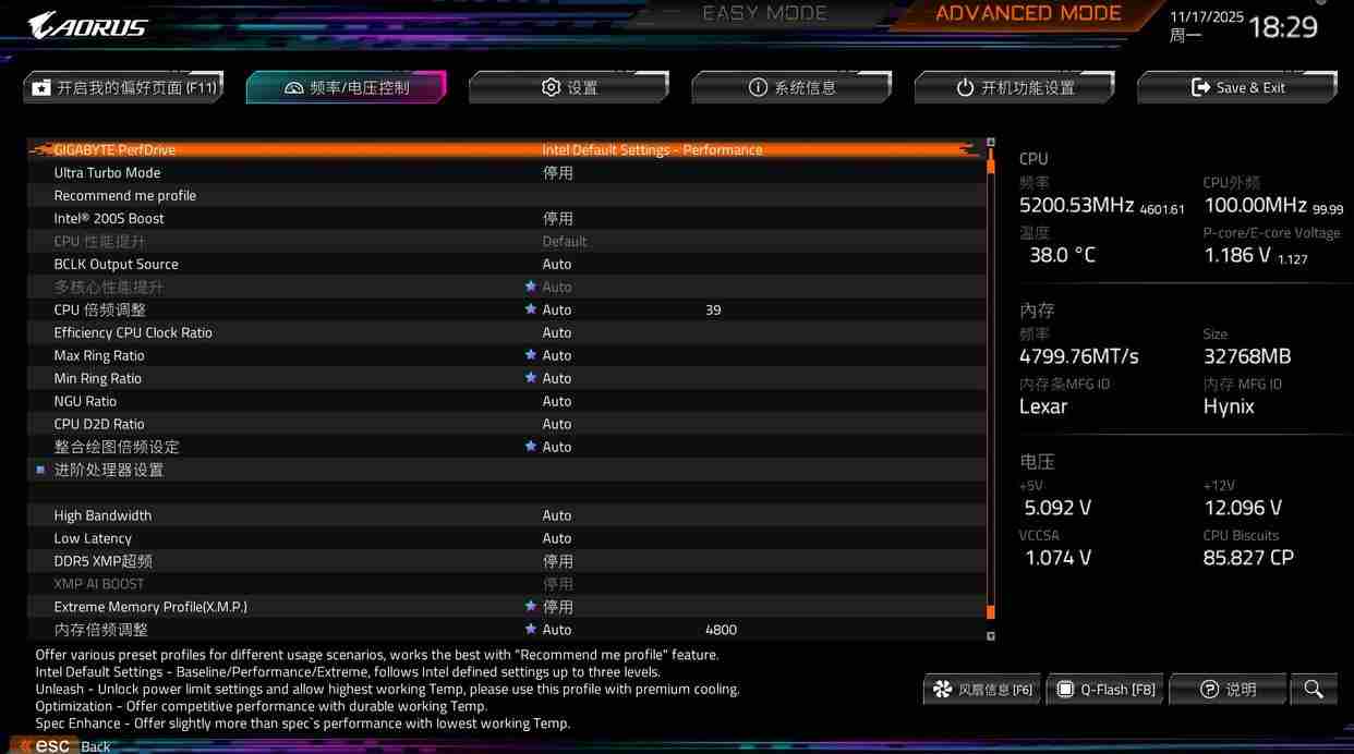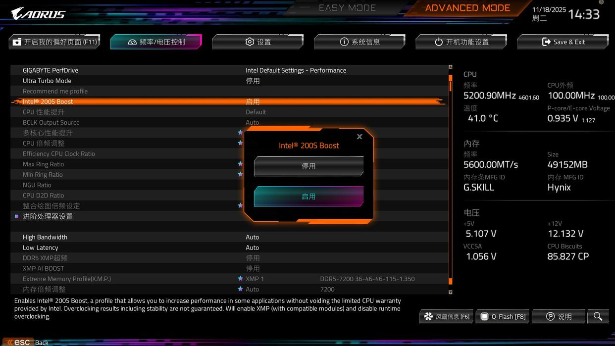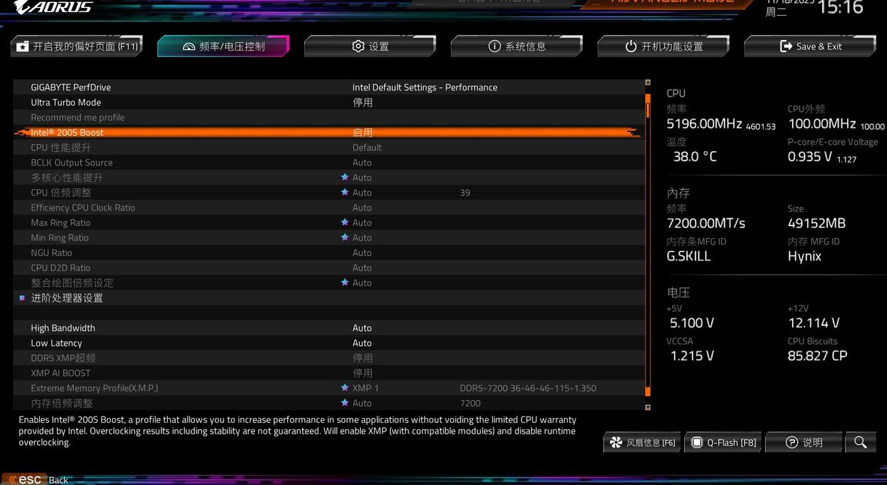 在年中英特尔与技嘉等板厂合作为酷睿ultra 200s系列处理器打造了专属intel® 200s boost模式,开启之后会一键优化处理器频率,与隔壁pbo很像,能够实现一键超频,从而提升性能表现,并且保证处理器温度和电压都处于安全区间。