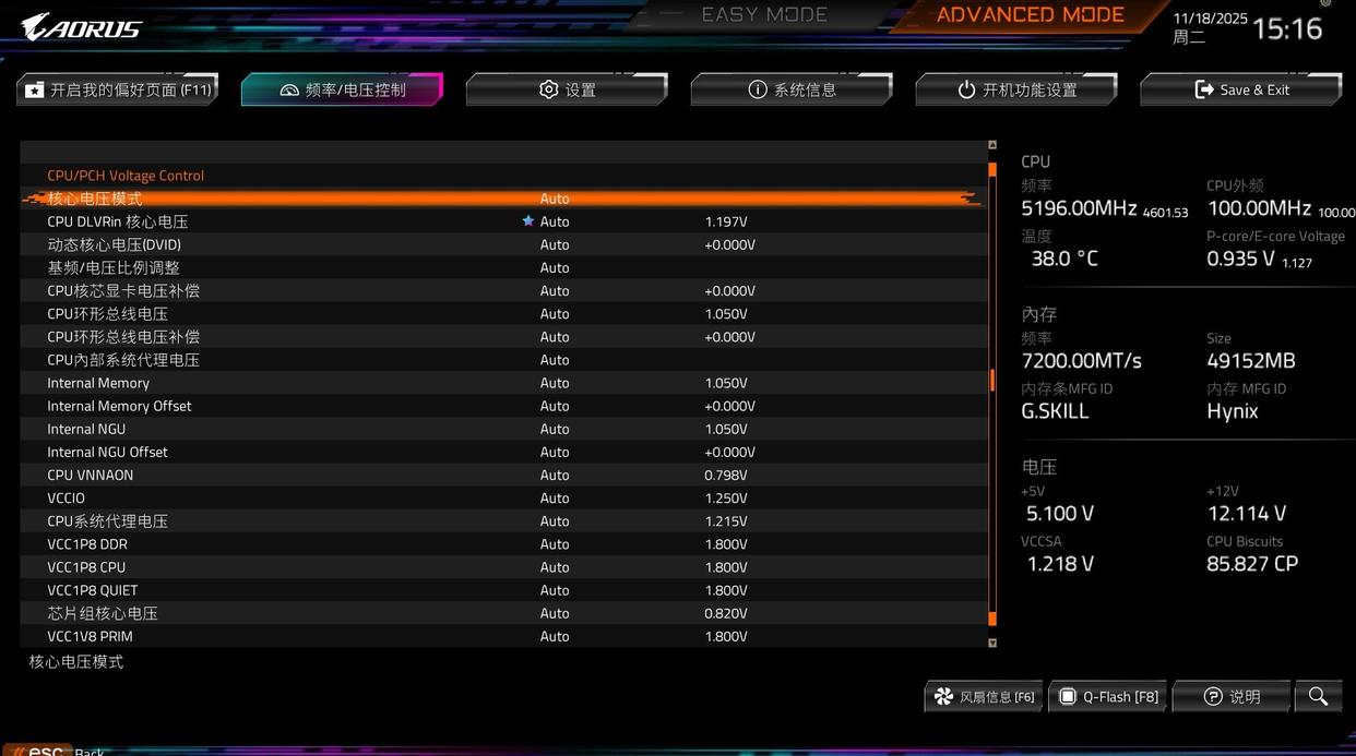 最底下选项针对电压设置,包括cpu以及内存电压选项,酷睿ultra 200s支持ngu频率调节,所以提供了ngu电压选项。